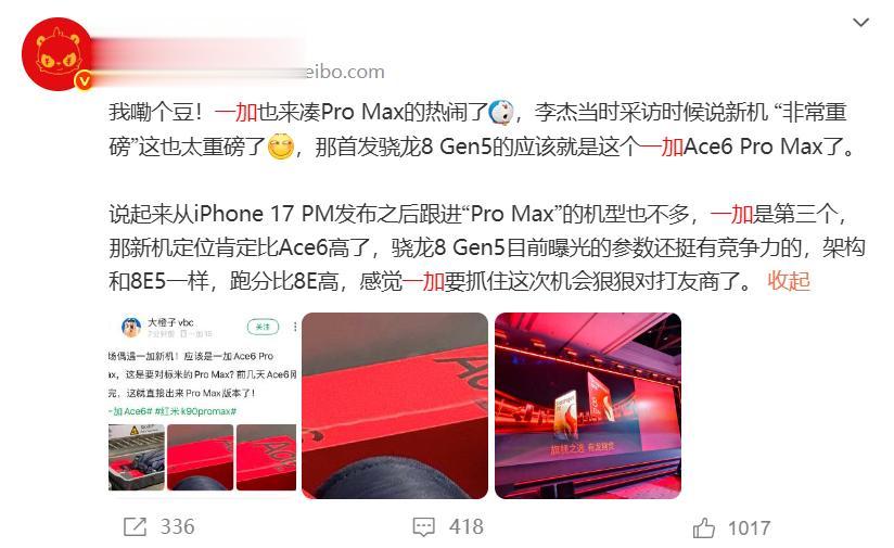 近期一加新机被爆,命名很有可能是一加ace 6 pro max,结合直接各大博主的爆料,年底这款新机应该是首发搭载骁龙8Gen 5处理器的机子,既然命名为pro max,估计还有一些不同的惊喜。