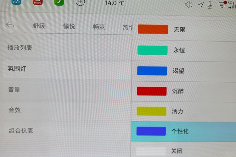 第3个功能是氛围模式的设定。该车的氛围模式,分为愉悦、畅爽、热情、宁静和个性化,共5种,满足不同的喜好与需求。