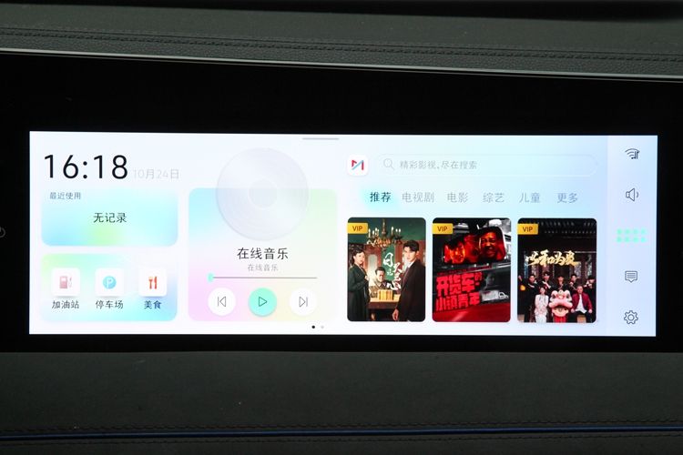 副驾娱乐屏11.6英寸,屏中资源比较多,各种题材的视频,在这儿基本都能找到。