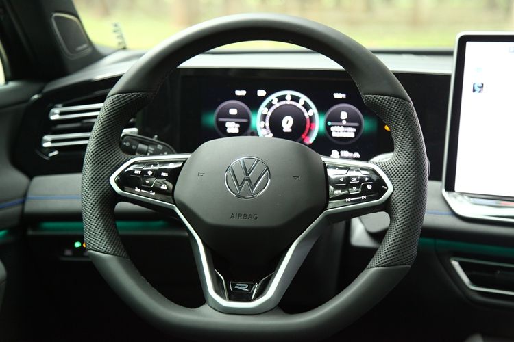 方向盘采用皮质包裹,具备加热功能,操作键是触控式,左手区域的操控主要是驾驶辅助,右手是界面设定、语音操作等。