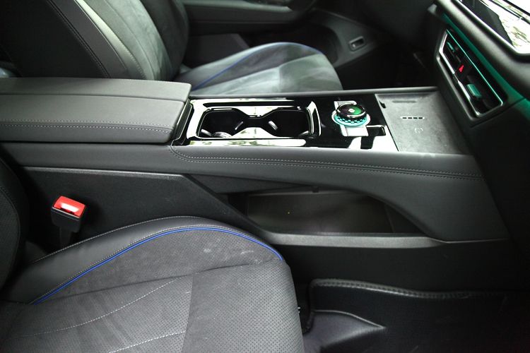 中间平台的前段,是手机无线充电位,中段是操作旋钮和双杯座,后段是中央扶手与中央储物盒。此外,中段的下部是镂空的。